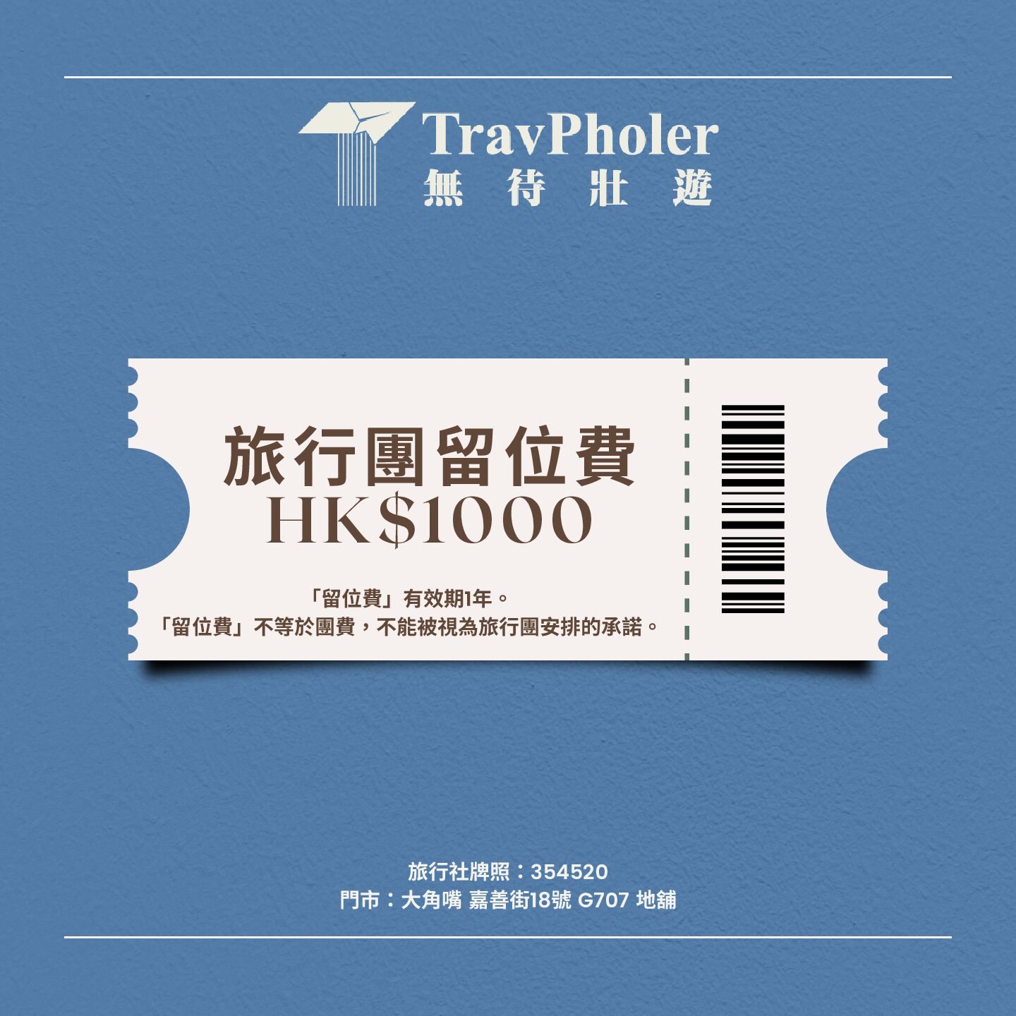 - 在繳交「留位費」起計 1年內,如旅客未能確定參與的旅行團並繳清團費,「留位費」將自動作廢,恕不退還。